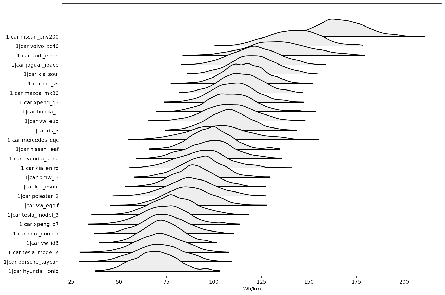 There is plenty of overlap in these posteriors, but they do show that e.g., Tesla, Hyundai and Porsche seem to have good base efficiency, while Jaguar, Audi, and Volvo appear to have poor efficiency.
