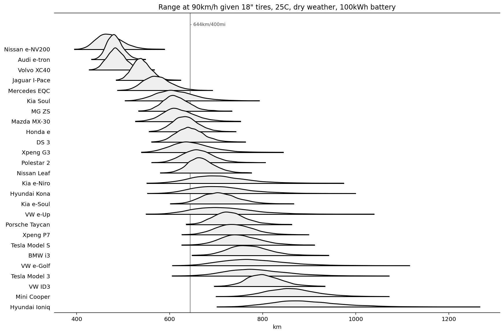 We can also look at the estimated range for each car at 90km/h given dry weather, 18" tires, 25C and a 100kWh battery. (Caveat: I don't know how to adjust the range for additional battery weight, so there is an unfair advantage for cars with small batteries.) Still, these results show that once battery density increases a bit, several cars may be able to hit the 400mi/644km range.