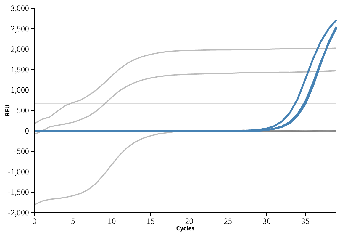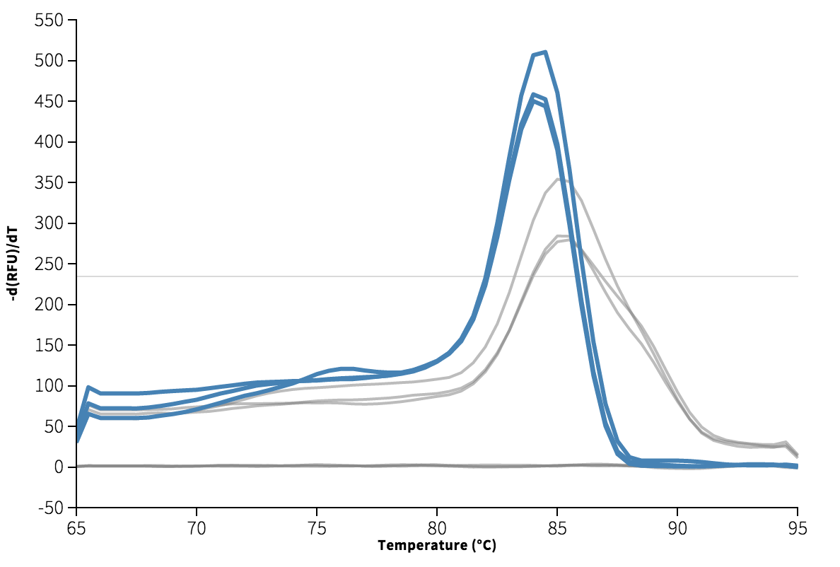 We can see from the melting curve and amplification plots below that there is some signal in the non-template wells, indicating the presence of some double-stranded DNA. Ideally, since there is no template in these wells, we expect only single-stranded primer DNA, and no signal.