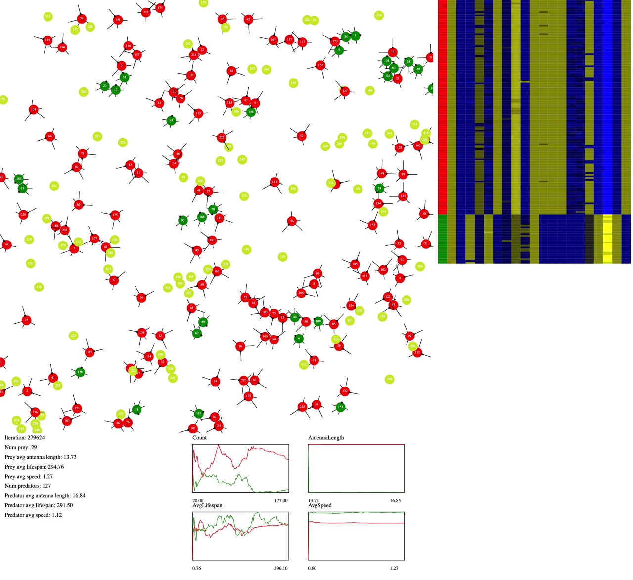 This is a simple experiment in simulating evolution and predator–prey dynamics, where the predators and prey have simple brains that learn to sense their environment.