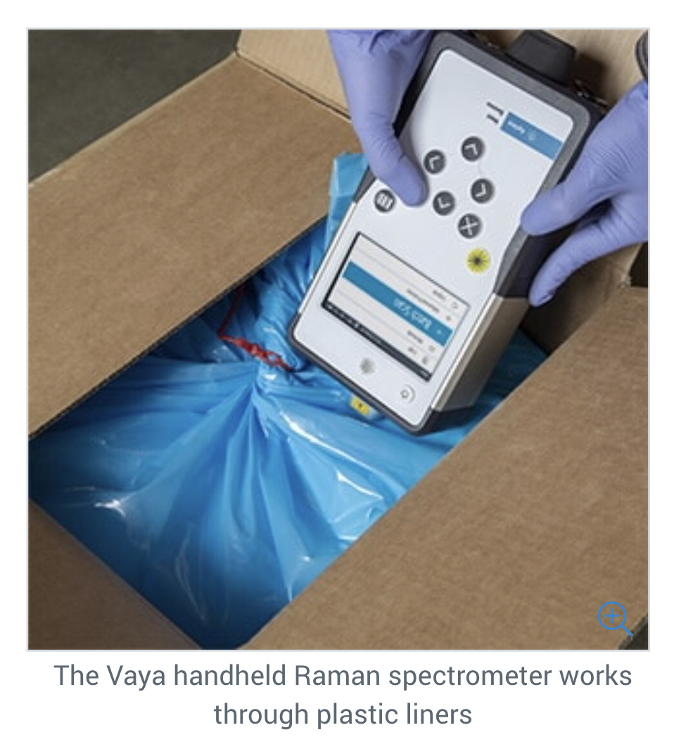You can actually buy a handheld Raman spectroscope for raw material identification. It is very cool technology, but the examples show identification of bulk ingredients (e.g., a vial of lactose), which you expect to have a consistent spectroscopic pattern. Picking out specific analytes from a complex mixture is much harder.