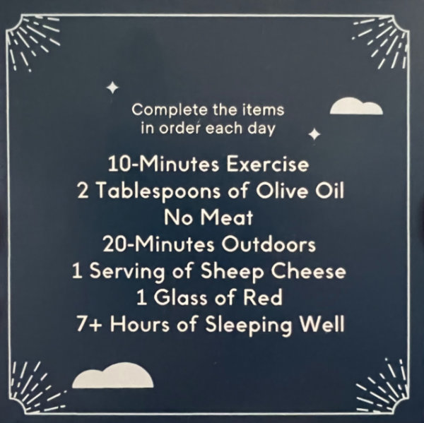 I get that Sardinians do the things listed more than other populations, and are regarded as having a healthy diet and lifestyle, but it is a strange mix of things.